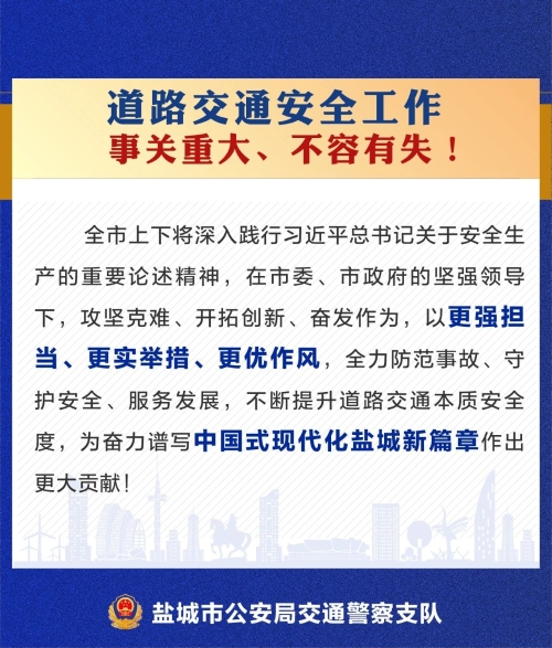 1月26日,市政府召开2024年全市道路交通安全工作暨春运交通安全工作会议,深入学习贯彻习近平总书记关于安全生产工作的重要论述精神,认真落实省市两会和全省道路交通安全电视电话会议部署要求,总结2023年全市道路交通安全工作,全面部署今年道路交通安全和春运交通安全工作,动员全市上下全力以赴防风险、保安全、促发展、惠民生,为奋力推进中国式现代化盐城新实践营造更加安全畅通、文明和谐的道路交通环境。副市长、市公安局局长谢继步出席会议并讲话;大丰区委书记李志军到会致辞;市政府副秘书长陶晓林主持会议;市委办、市政府办副主任宋卫星参加会议;市交通运输局局长黄正桂,市公安局党委副书记、副局长王玉海通报相关情况。会前,与会人员还集中观摩了大丰草堰交警中队、机动车登记服务站和超限检测站。